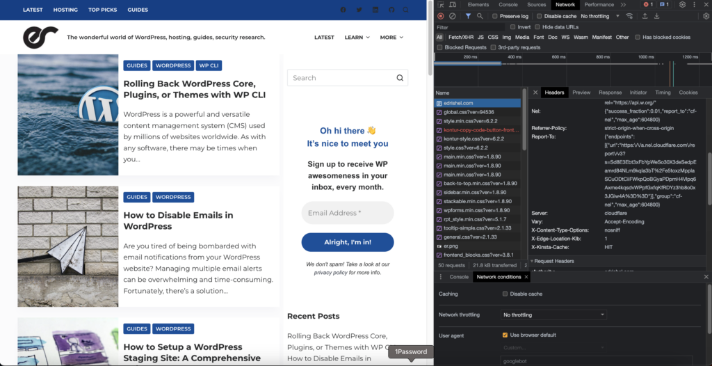 In this example, we’re checking this website again, in the network tab we can see a x-kinsta-cache header which confirms that this website is hosted by Kinsta.
